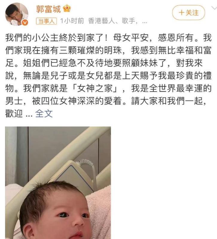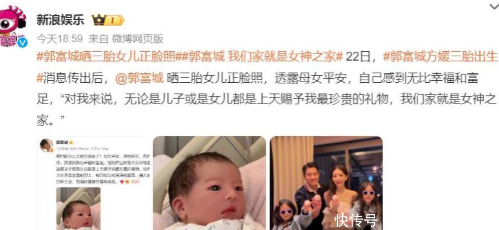 接连两个女儿的出生已经让外界传言纷纷,甚至在郭富城的头上扣上了“绝户头”的标签。这尤为重要的第三胎也成为了郭富城和方媛回击外界讥讽的最强证明随着婴儿的呱呱坠地,一个新生命进入到了天王郭富城的家中。郭富城官宣第三胎还是女儿,直言自己是 “被四位女神爱着的最幸运男士”。